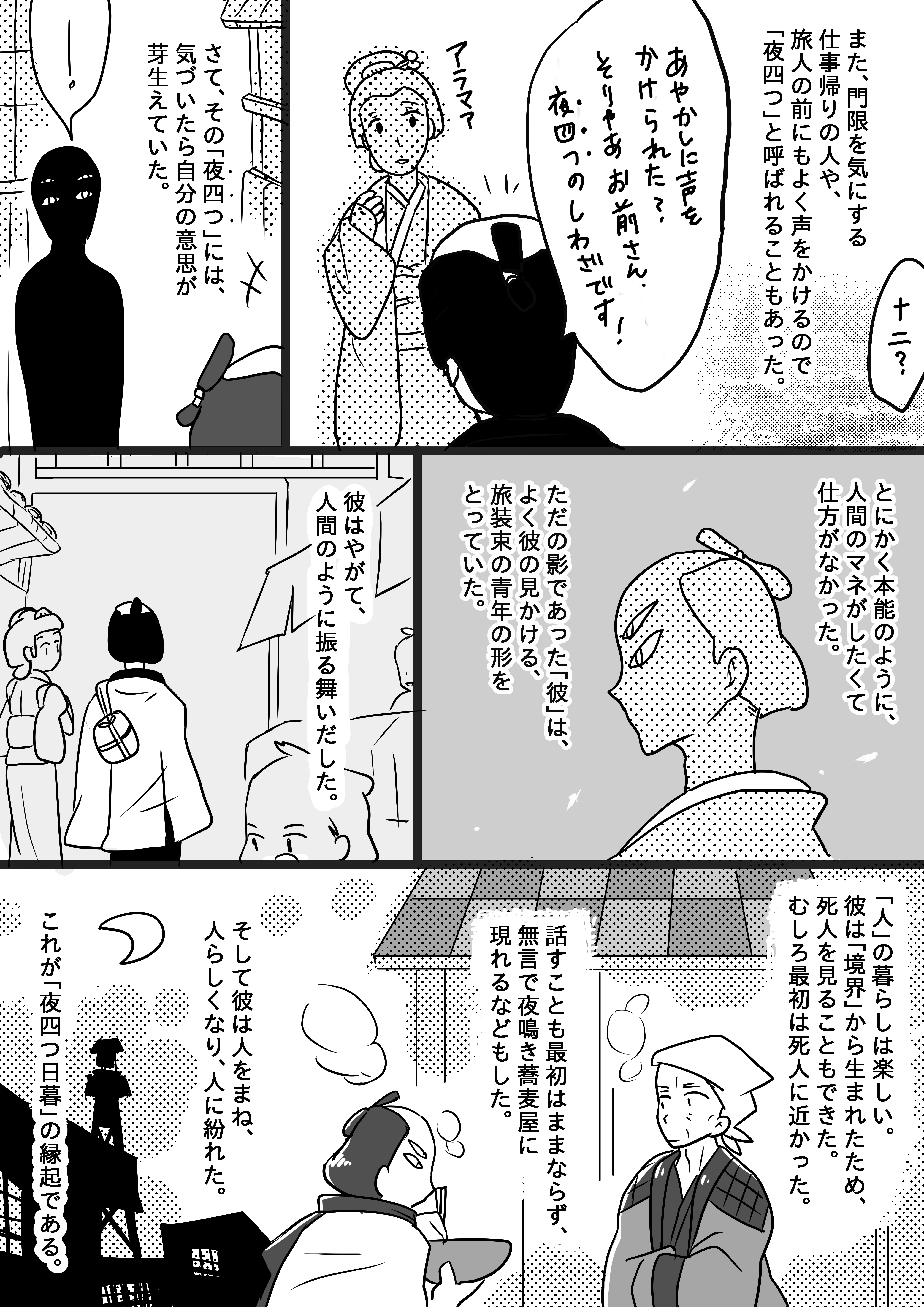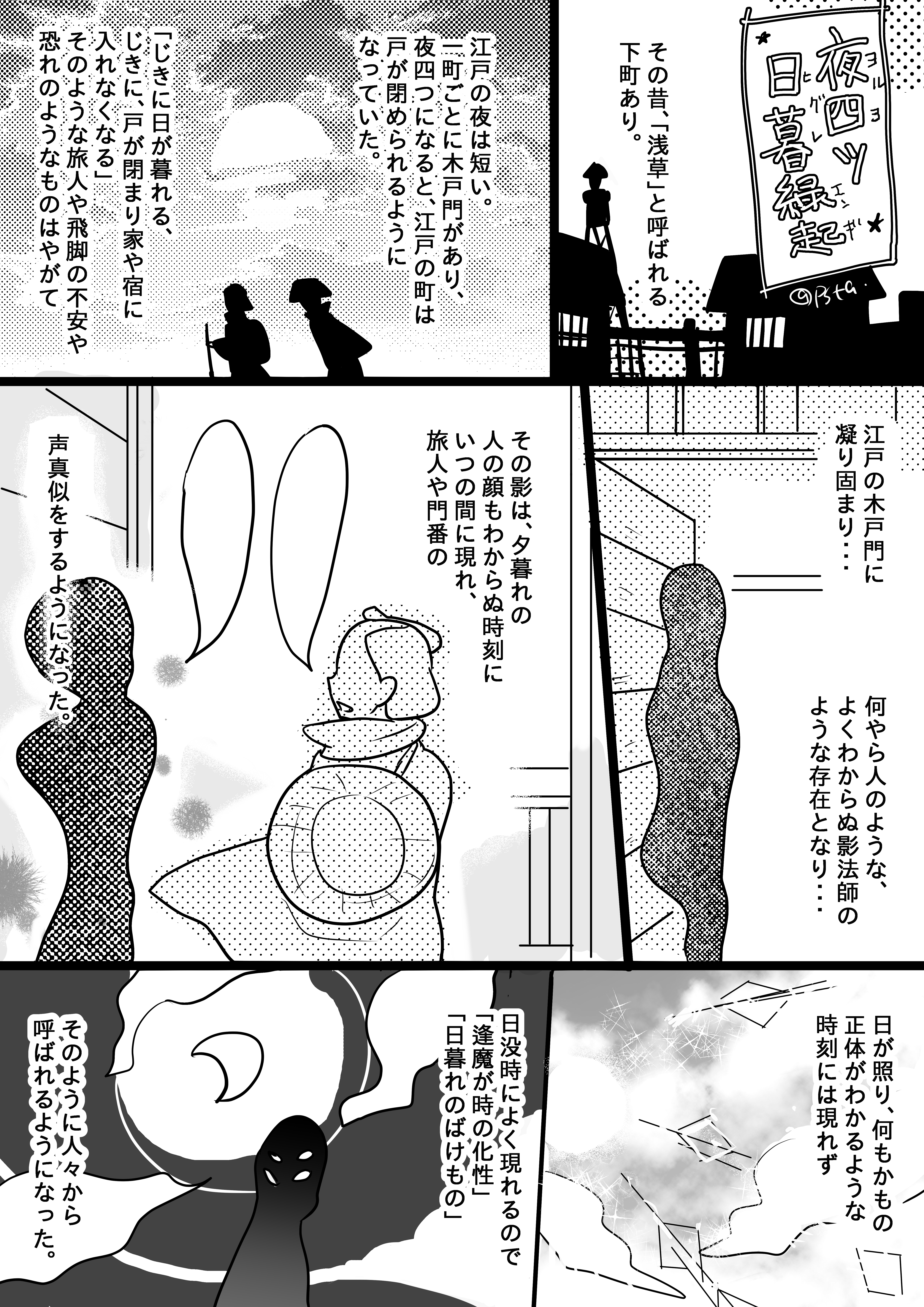 original 複数枚あり・漫画人外魔境浅草という企画で作っていた自キャラの昔のお話。2016年の作品でした…夜四ツ 日暮(よるよつ ひぐれ)江戸時代中期くらに生まれて、木戸門あたりに発生した妖怪。別名「木戸門日暮(きどもんひぐれ)時間と空間の境界、黄昏時の妖怪、ものまね妖怪